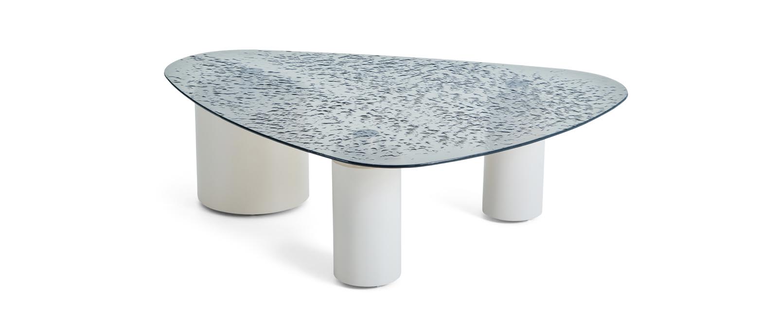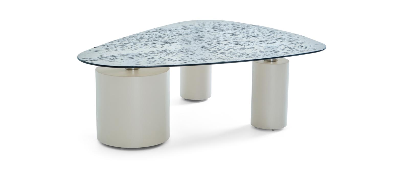 Orta sehpa setinin tablası, 10 mm kalınlığında dokulu döküm bronz camdan üretilmekte olup, cam yüzey bronz, clear, füme veya yeşil renk seçenekleriyle sunulmaktadır. Döküm camın altında yer alan metal rozetler lazer kesimle hazırlanır. Ürünün ayakları ise esnek kontraplaktan üretilmiş olup, cam altındaki metal rozetlere tij saplama yöntemiyle alttan bağlanır. Ayaklara tüm RAL renklerinde lake uygulaması yapılabilmektedir.